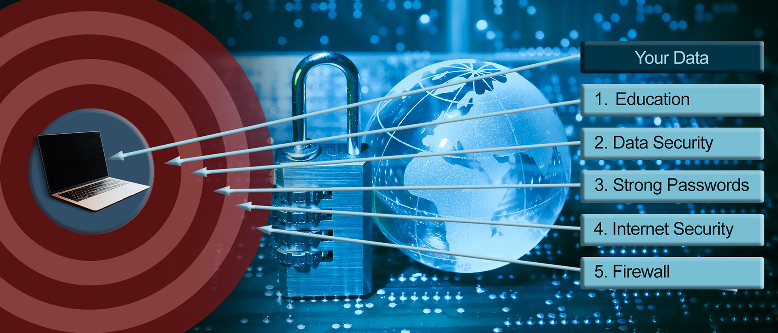 In the business world people focus on 7 layers of data security but these do not all apply in a home environment. We’ve have chosen to focus on 5 of them because a small change in these key areas will have a big impact on protecting you and your data.